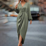 Eleganță – Rochie Damă Satinată Midi cu Decolteu în V și Mâneci Lungi