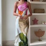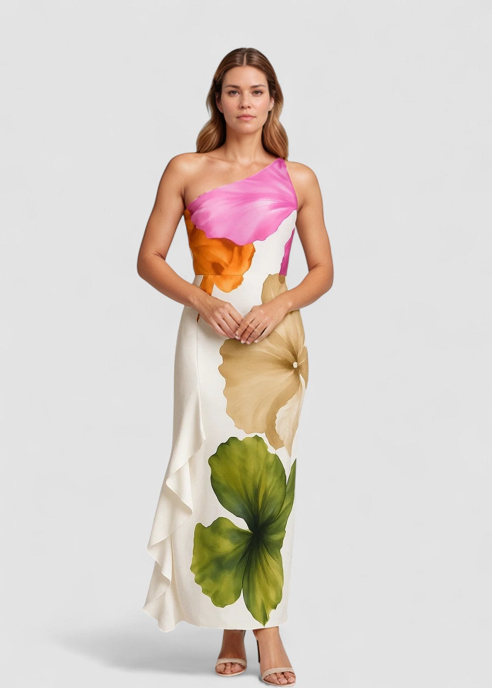 Jorgina – Rochie de Damă Maxi Asimetrică cu Volane și Imprimeu Floral