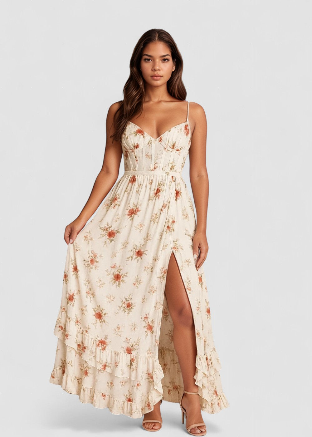Yana – Rochie Maxi de Damă Elegantă cu Volane și Imprimeu Floral