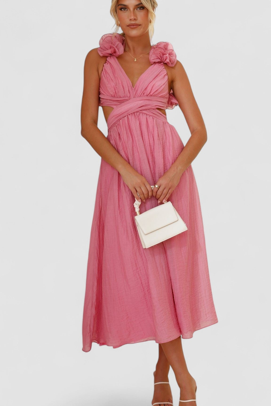 Ava – Rochie Midi Damă Roz cu Mâneci Puff și Croi Fluid