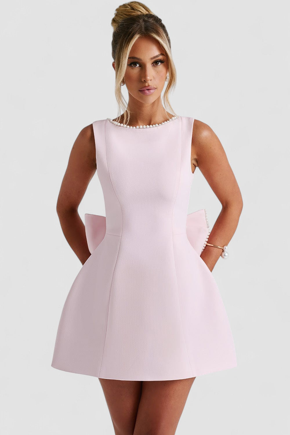 Elle – Rochie Mini de Damă cu Fundă și Perle