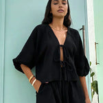 Set format din pantaloni scurți și bluză cu mânecă lungă, cu detaliu de fundă